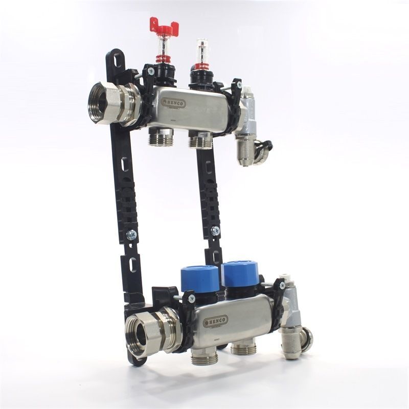Aukštos kokybės nerūdijančio plieno 2 žiedų grindinio šildymo kolektorius su integruotu srauto matuokliu. Patikimas, atsparus korozijai ir lengvai montuojamas sprendimas grindinio šildymo sistemoms.