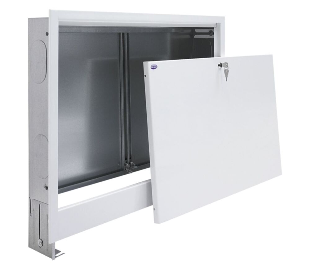Spinta pagaminta iš metalo, dažyta balta spalva, dažnai su reguliuojamo gylio konstrukcija, leidžiančia pritaikyti spintą pagal sienos storį. Konstrukcija skirta ne tik estetikai, bet ir funkcionalumui – suteikiant pakankamai vietos vamzdžiams, montavimo komponentams ir kolektorių sistemoms.