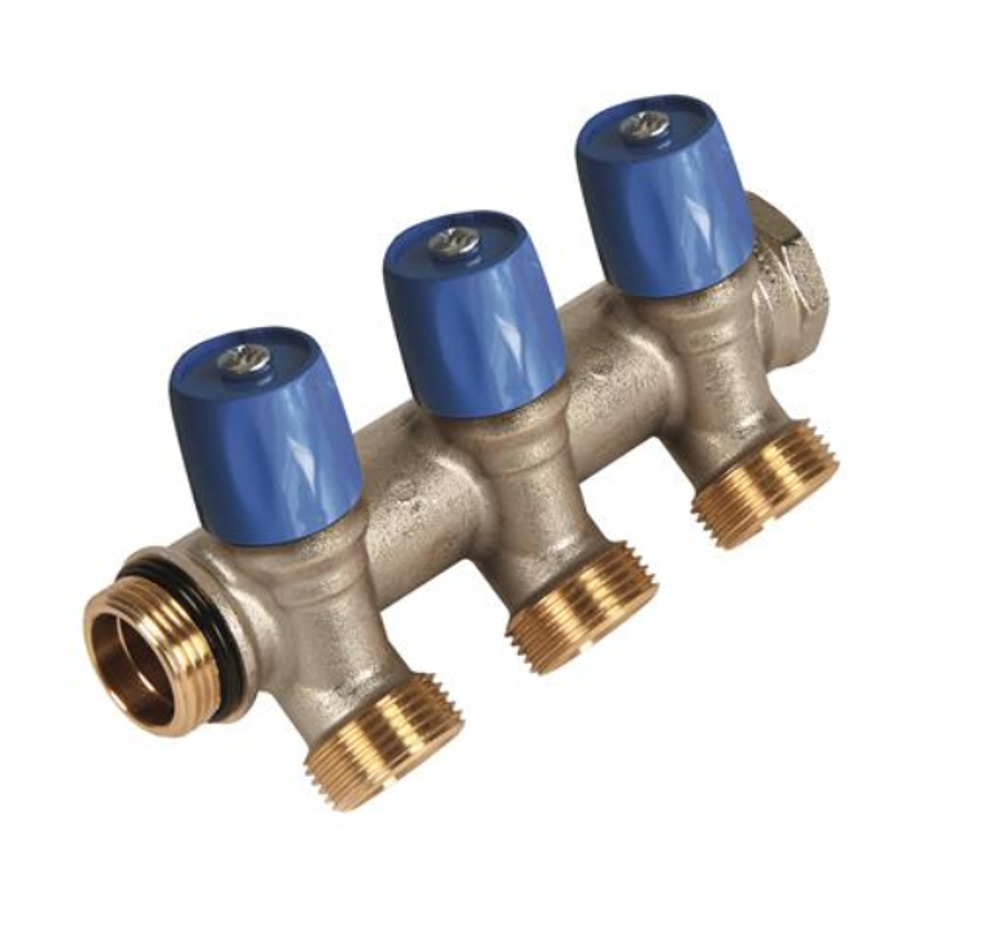 2 šakų vandentiekio kolektorius su įstrižo uždarymo ventiliu, mėlynas 3/4″ prijungimas. Puikus pasirinkimas namų santechnikai.